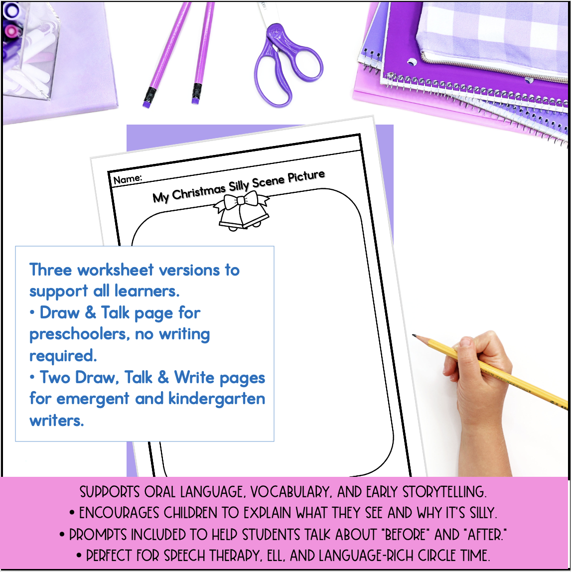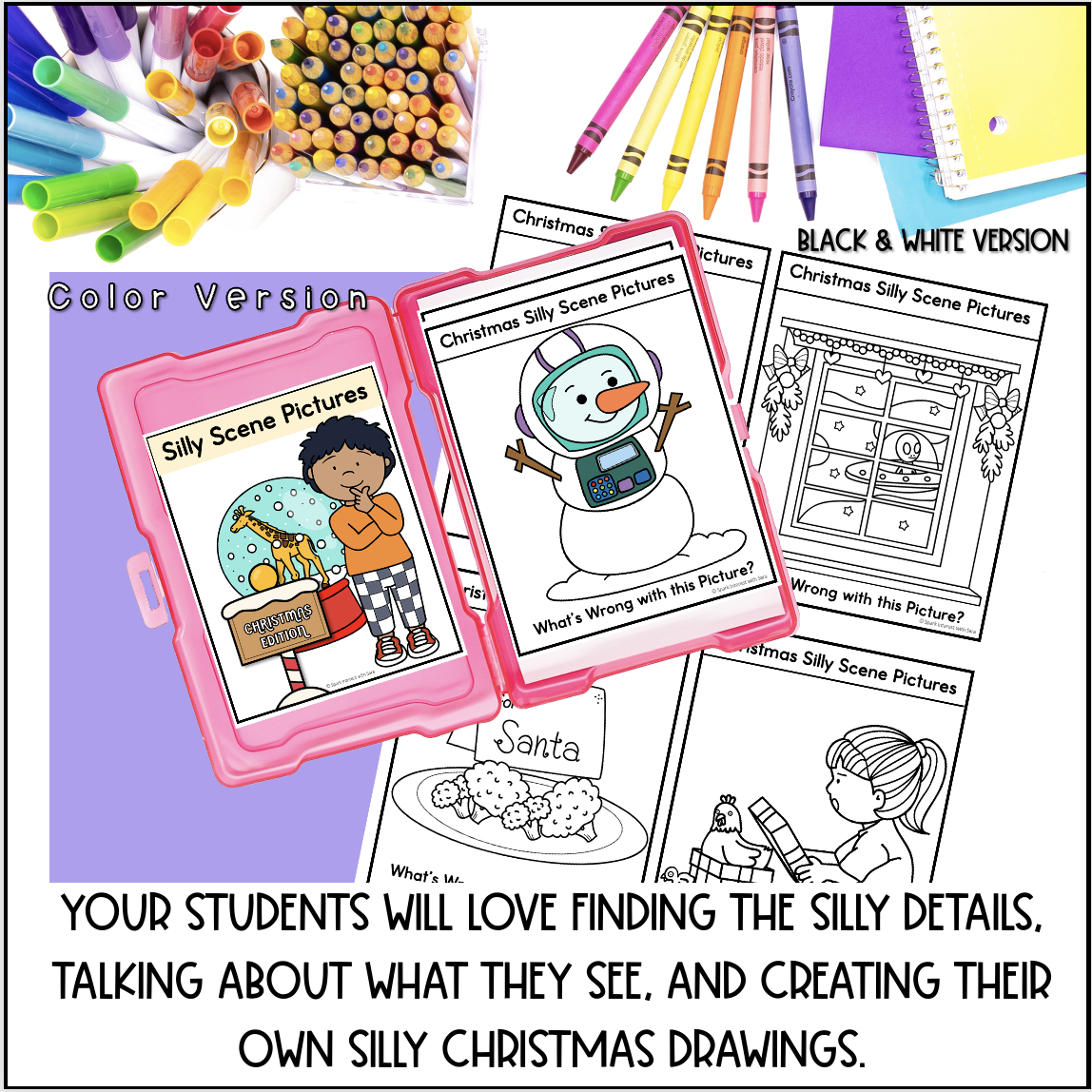 Make December learning fun and engaging with these Christmas Silly Scene Pictures designed for Preschool, Pre-K, and Kindergarten! Your students will love finding the silly details, talking about what they see, and creating their own silly Christmas drawings. Perfect for December activities, Christmas literacy centers, morning tubs, and Holiday task boxes.