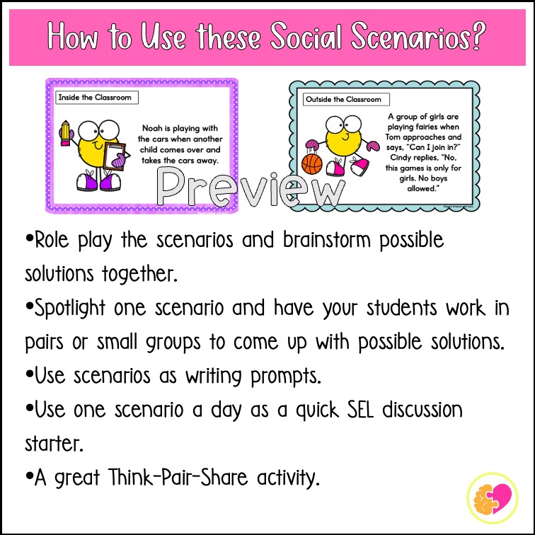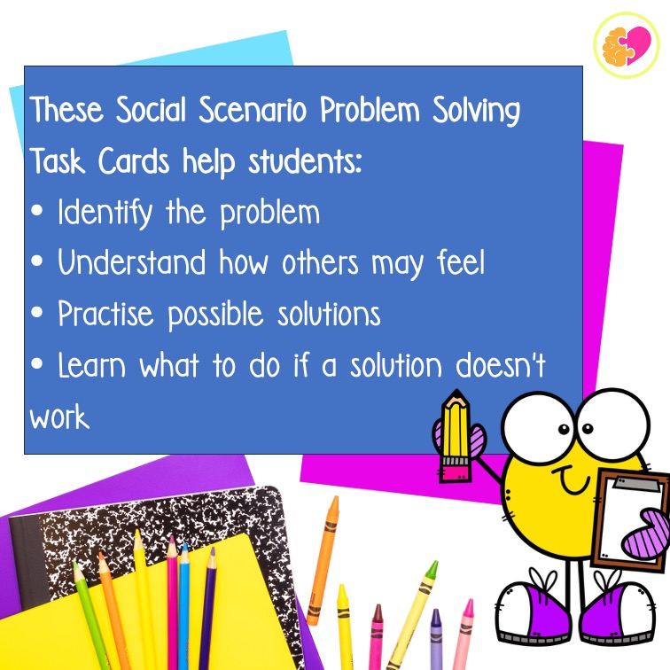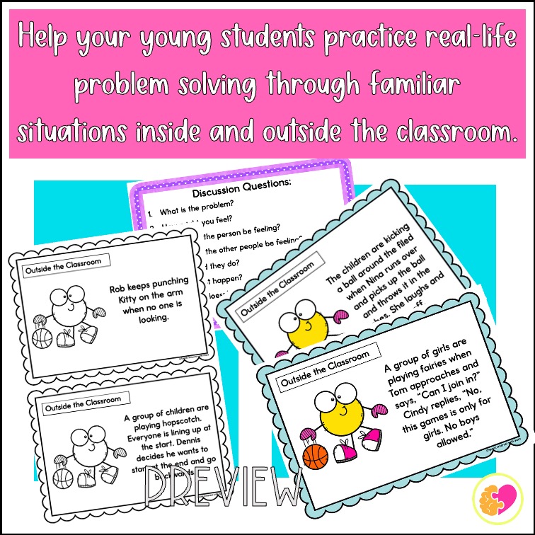 These Social Scenario Problem Solving Task Cards present common classroom and playground situations that children may encounter with friends. They give students the opportunity to identify problems, talk about feelings, and explore possible solutions together.